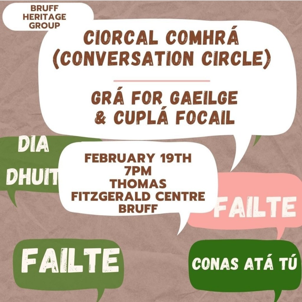 Our next event we are delighted to announce is this Saturday where will host the first of our Ciorcal Comhrá -conversation circle this Saturday 19th at 7pm.