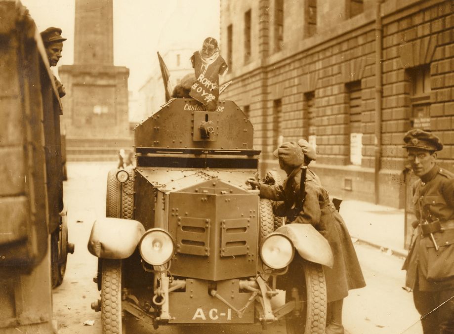 The use of armoured cars in this conflict showed the change from guerrilla tactics and the distinct advantage in armoured cars becoming clear in the action seen in Bruree with both sides now holding armoured cars. On the Republican side, it was a Cork man Jim Gray who ran a successful garage in Cork being not only a gifted driver and mechanic; he was responsible for the building of improvised cars for the anti-treaty side. It was shortly after the withdrawal from Limerick City that the Republicans holding Ash Hill Towers, a gothic style mansion providing them with all vantage points of the town in Kilmallock that they received the newly built “River Lee”. A Lancia armoured car, built by Gray, covered with inch-thick iron plate. As mentioned in Irish Story, “These were quick and dirty, ugly war machines, remarkable to all who saw them, but it was the sheer intimidating bulk of the River Lee which left the greatest impression on the republican fighters” with Jamie Moynihan from Ballyvourney famously described it as cruising around Kilmallock looking like a labourer’s cottage. Others such as Frank O’Connor describing it as a ridiculous fighting vehicle but that it did intimidate the enemy.
