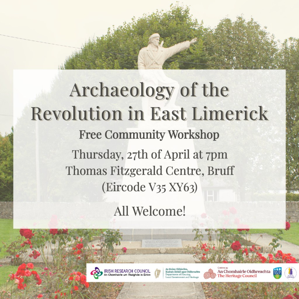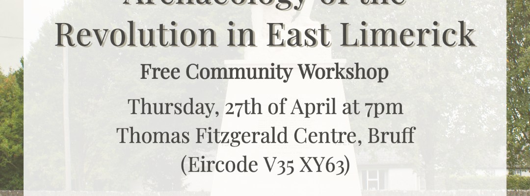 We are delighted to be one of the local communities chosen by UCD and Abarta Heritage to host one of their free workshops for the Archaeology of the Irish Revolution in East Limerick Thursday 27th April at 7pm.