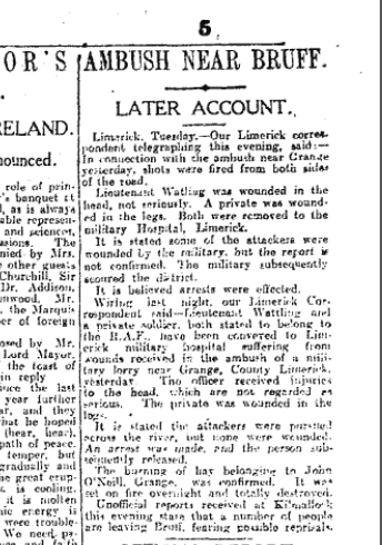 Luckily, none of the other lorries were able to make it over the river to the other side and remained south side of the water on the bend. When the British had begun to advance on their position, the cover they had on the Croker estate side in the grove under trees allowed them to open fire and push them back. The whole party then began their retreat. At one stage while retreating, Richard O’Connell of the Caherconlish volunteers realises that there were men still in Sheahan’s cottage opposite the lodge gate at the time of retreat and he ran down to get them out and they retreated eastwards. The British Regiment’s official account says that the rebels were speedily dealt with and a quantity of arms, ammunition and two prisoners were taken. Despite a number of the witness statements believing there were a number of officers shot dead, it would appear that no British soldiers were killed in the ambush, as there are no press reports of British Deaths. They do refer to Flying Officer Watling and Bandsman Bailey both being wounded, the latter seriously.