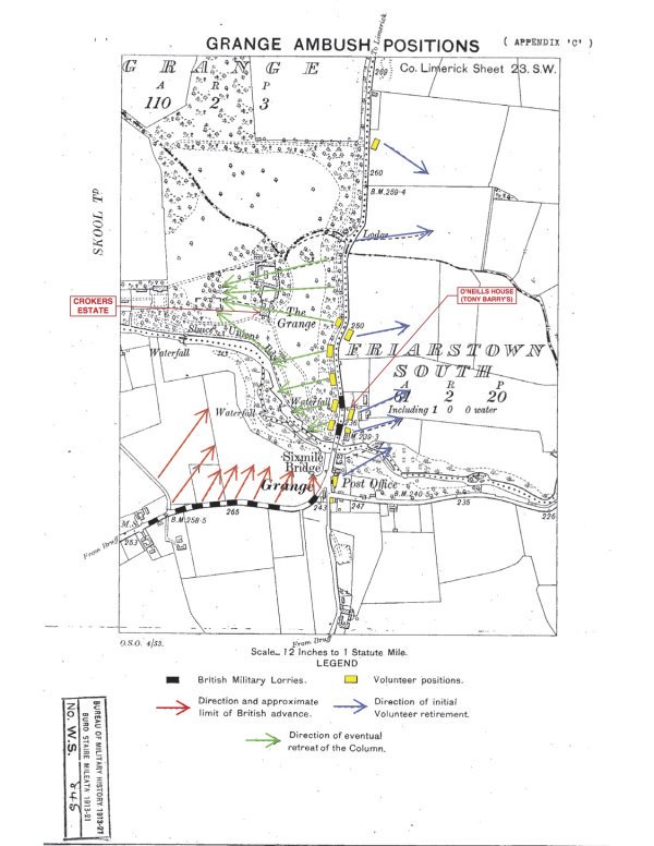 On this day 8 November in 1920, about 50 men of the 3rd Battalion of East Limerick, prepared around 5am on a cold morning. They were armed with 21 rifles and 21 shotguns and small quantity of explosives. It had been decided for them to ambush a British convoy at Grange bridge, about four miles from the town of Bruff. They set out and occupied positions, around John O’Neill’s house. At a quarry on the south of the bend, a number of volunteers were posted there with the reserve of the bombs and ammunition.