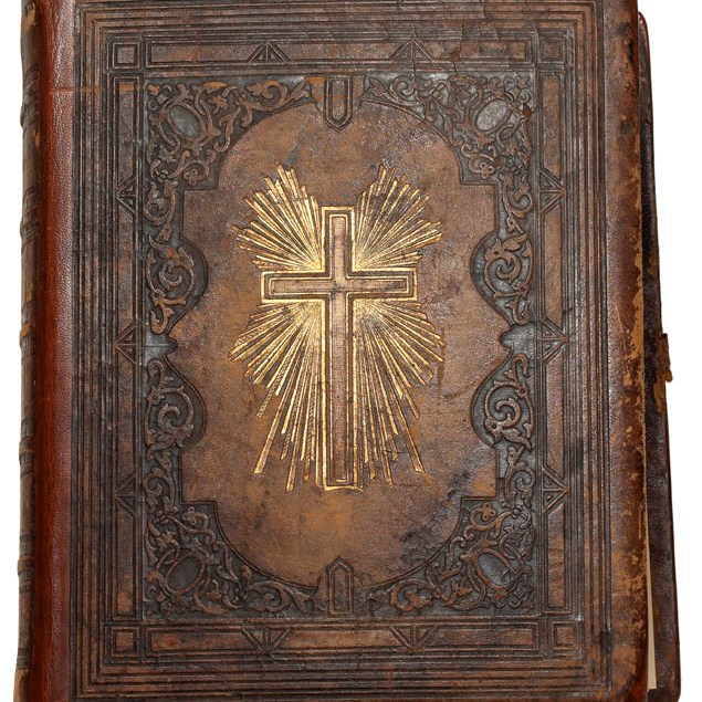 The bible is leather bound with a gold leaf cross on the cover. It contains 5 handwritten pages of the Fitzgerald family record, starting with Thomas A. Fitzgerald in 1857. There are notes for the engagement of Rose E. Fitzgerald and Joseph P. Kennedy, their marriage in October 1914, and a list of births for their nine children.